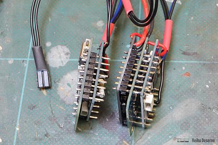 Die Platinen werden verlötet. Die Verbinder liegen den Hardware-Komponenten bei. Der rechte Aufbau zeigt die 2s-Variante mit dem zusätzlichen Step-Down-Regler.