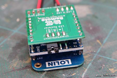 Die Bilder des Locoremote-Empfängers zeigen die Mini B-Variante für 3 bis 6 V. Die dritte Platine sorgt für Licht und weitere Ausgänge.