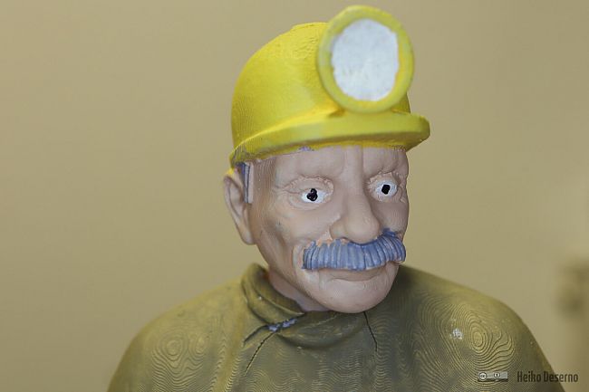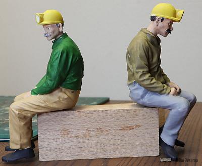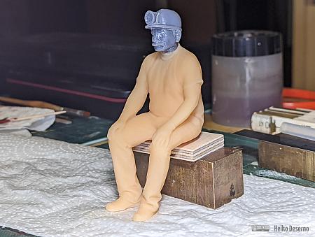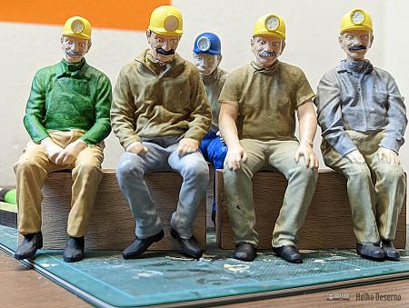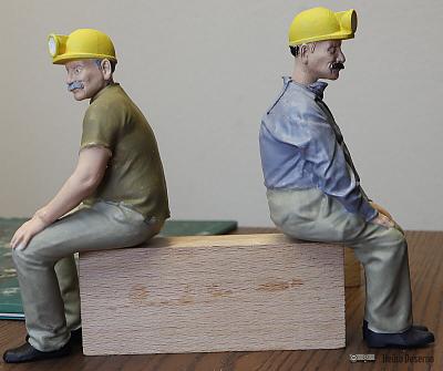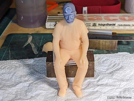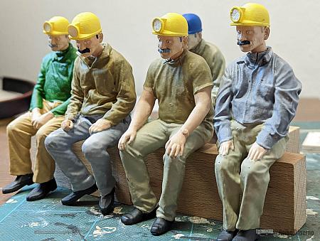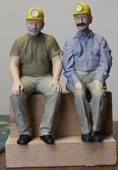 Da nicht unendlich viele Figurenmodelle verfügbar sind, müssen Variationen her. Neben verschiedenen Farben bei der Bemalung oder unterschiedliche Druckgrößen sind unterschiedliche Köpfe ein interessantes Gestaltungsmittel. Für alle Grubenarbeiter und Mitfahrer im Personenwagen habe ich einen typischen Grubenbahner-Kopf mit Helm und Lampe verwendet. Dieser stammt von David Clavey, der allerlei Figuren anbietet.