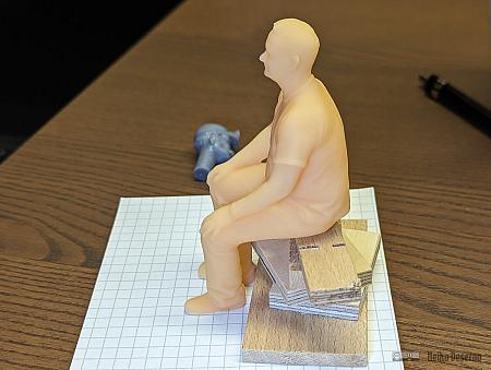 Die Figur ist tatsächlich in Originalgröße (1,41 m Sitzhöhe) abgebildet. Eine Skalierung auf 7,5 % entspricht dem Maßstab 1:13. Da nicht alle Menschen gleich groß sind, kann der Skalierungsfaktor auch etwas variieren. Fahrer für einige Lokmodelle passen mit einer Skalierung von 7 % besser. Oder auch im hier vorgestellten Personenwagen wurden die Figuren etwas kleiner hergestellt.