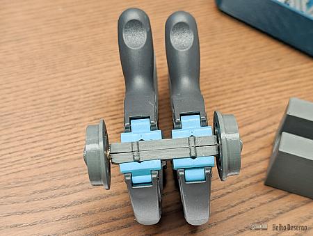 - Dann die Achse mit den Rädern in die Achsmontagehilfe (Bauteil 90) legen und zusammendrücken. Die Innenseiten der Spurkränze müssen an der Montagehilfe anliegen, nur so ist die Einstellung der Spurweite korrekt.