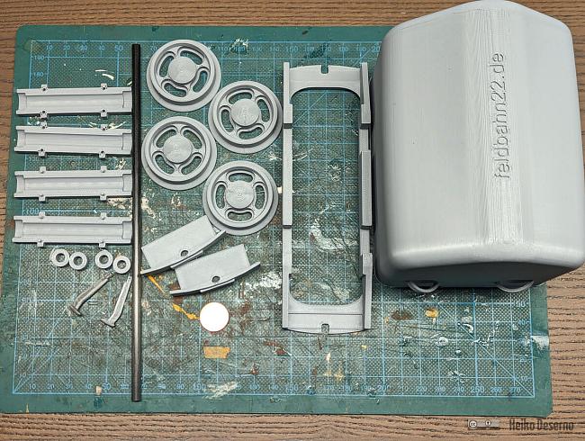Der Druck der vergrößerten Bauteile funktionierte problemlos. Die Wandstärken und die Passgenauigkeit der Bauteile sind sehr gut. Die Baugröße bringt jedoch meine Technik allerdings an ihre Grenzen. Der kleine Hunt und die Diema gehören zu den kleinsten Fahrzeugen in der Feldbahnwelt. Sie passen gerade noch auf das Druckbett. Es ginge noch etwas größer, aber dann wird es schwierig mit dem Gleisstück. Da hilft nur ein 3D-Drucker mit größerem Druckvolumen.
