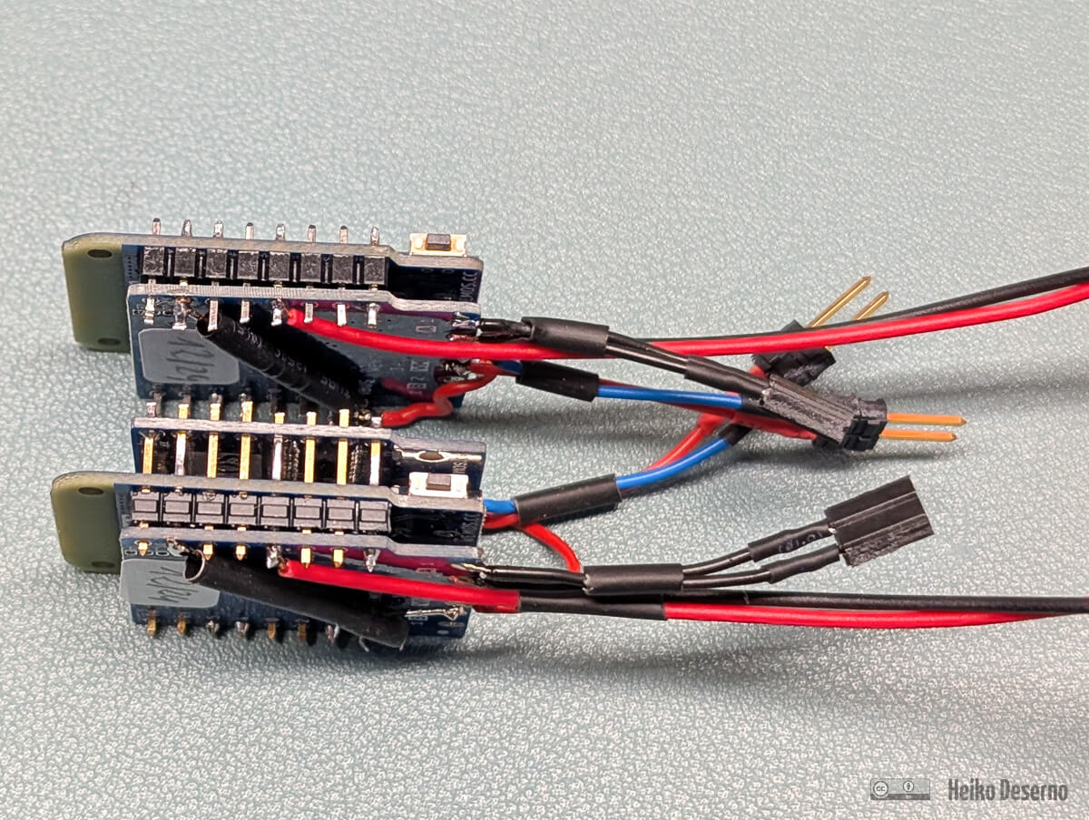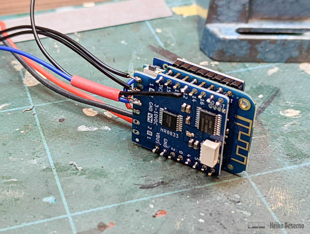 Das Layout der Lolin-Platinen erleichtert den Aufbau erheblich. Man kann sie übereinander platzieren und verbinden. Die entsprechenden Stiftleisten sind im Lieferumfang der Bauteile enthalten. Die Anschlussbelegung bleibt bei allen Platinen gleich. Dies gilt auch, wenn nicht alle Pins auf den Boards angeschlossen sind. Der Zusammenbau beider Platinen ergibt eine Höhe von etwa 12 mm.