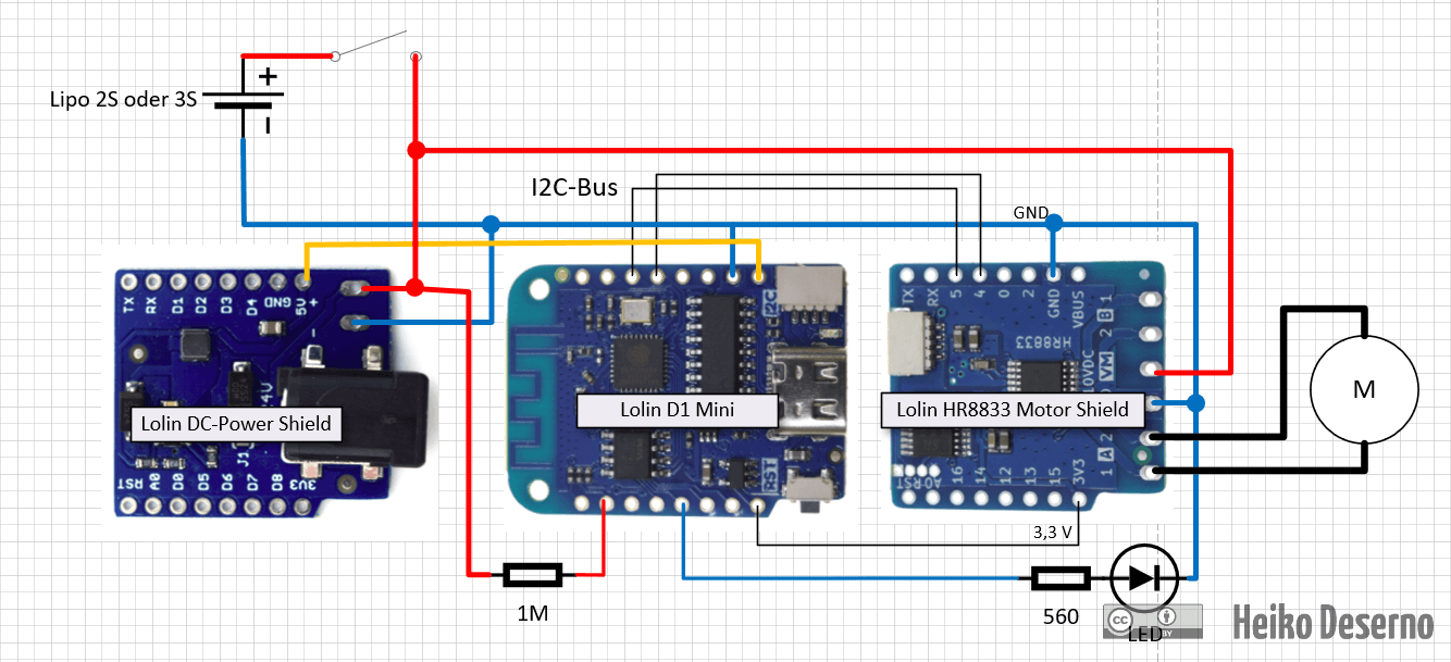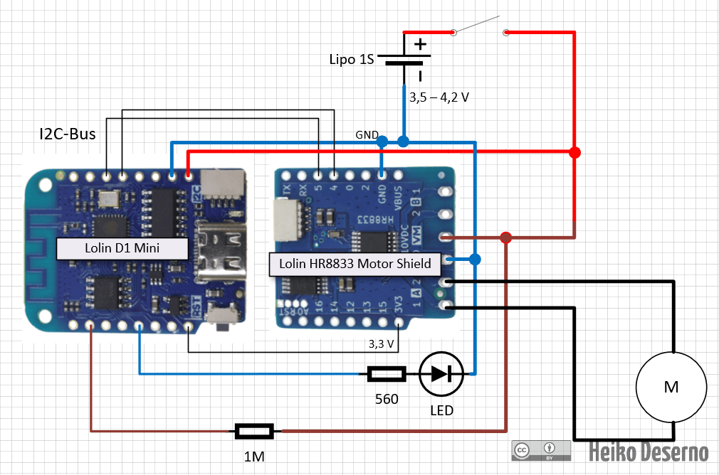 Für den Betrieb des D1 mini und des Motorshields spielt die Versorgungsspannung eine wesentliche Rolle. Der Microcontroller D1 mini arbeitet intern mit 3,3V und steuert damit auch die Motorshields. Er besitzt extern einen 5V-Anschluss, entweder über Pins oder USB. Von dort wandelt er die Spannung in 3,3V um. Die Eingangsspannung an diesem Anschluss kann zwischen 3,5V und 5V betragen. Dieser Bereich eignet sich perfekt für Ein-Zellen LiPo- oder LiIo-Akkus (3,7 - 4,2V) sowie 3 alkalische AAA-Zellen mit einer Spannung von 4,5V.