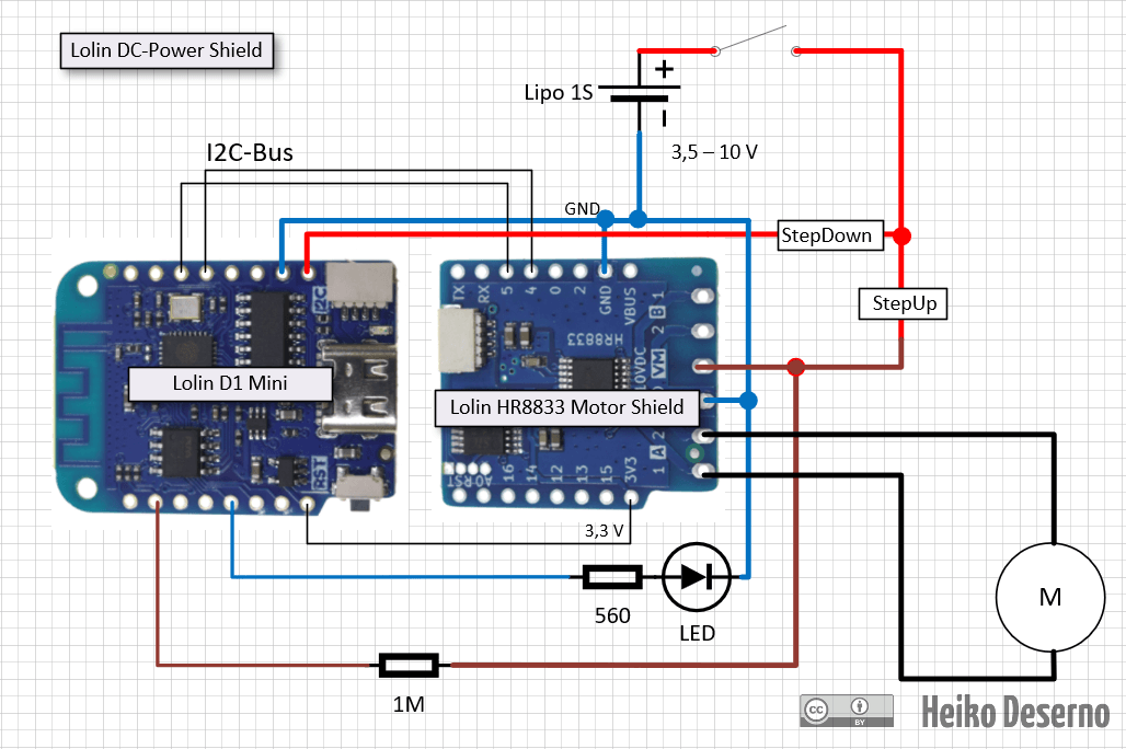 Zwei Akkuzellen liefern eine Spannung zwischen 7V und 8,4V. Diese Spannungsquelle passt ideal für 6V- oder 9V-Motoren. Da die Eingangsspannung über 5V liegt, muss man die Spannung für den Microcontroller herabregeln. Das Lolin DC Powershield übernimmt diese Aufgabe. Der Step-Down-Regler arbeitet in einem Spannungsbereich von 7 - 24V und bietet 5V Ausgangsspannung. Er behält das gleiche Platinen-Layout wie der D1 mini und das Motor-Shield. So ermöglicht er eine weitere Huckepack-Anordnung.