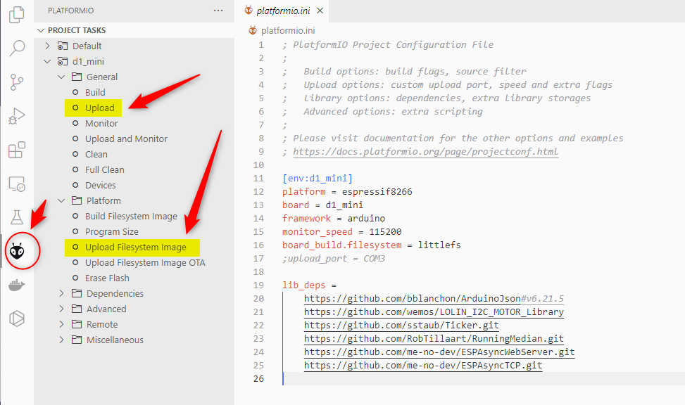 Upload: Dieses Kommando baut das Betriebssystem-Image und überträgt es auf den Microcontroller. Dazu verbindet man den ESP8266 über den USB-Anschluss mit dem PC.Upload Filesystem Image: Dieses Kommando packt die Web-Bestandteile in ein Image und überträgt es an den Microcontroller.
