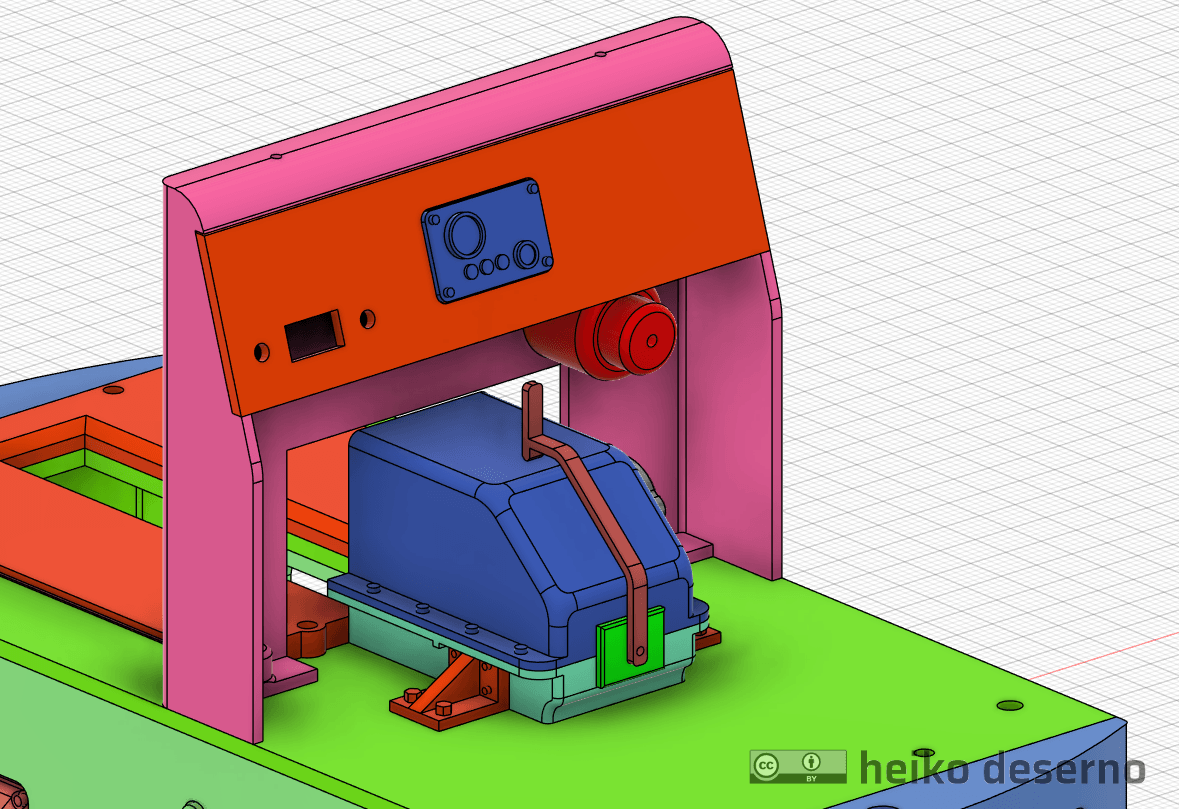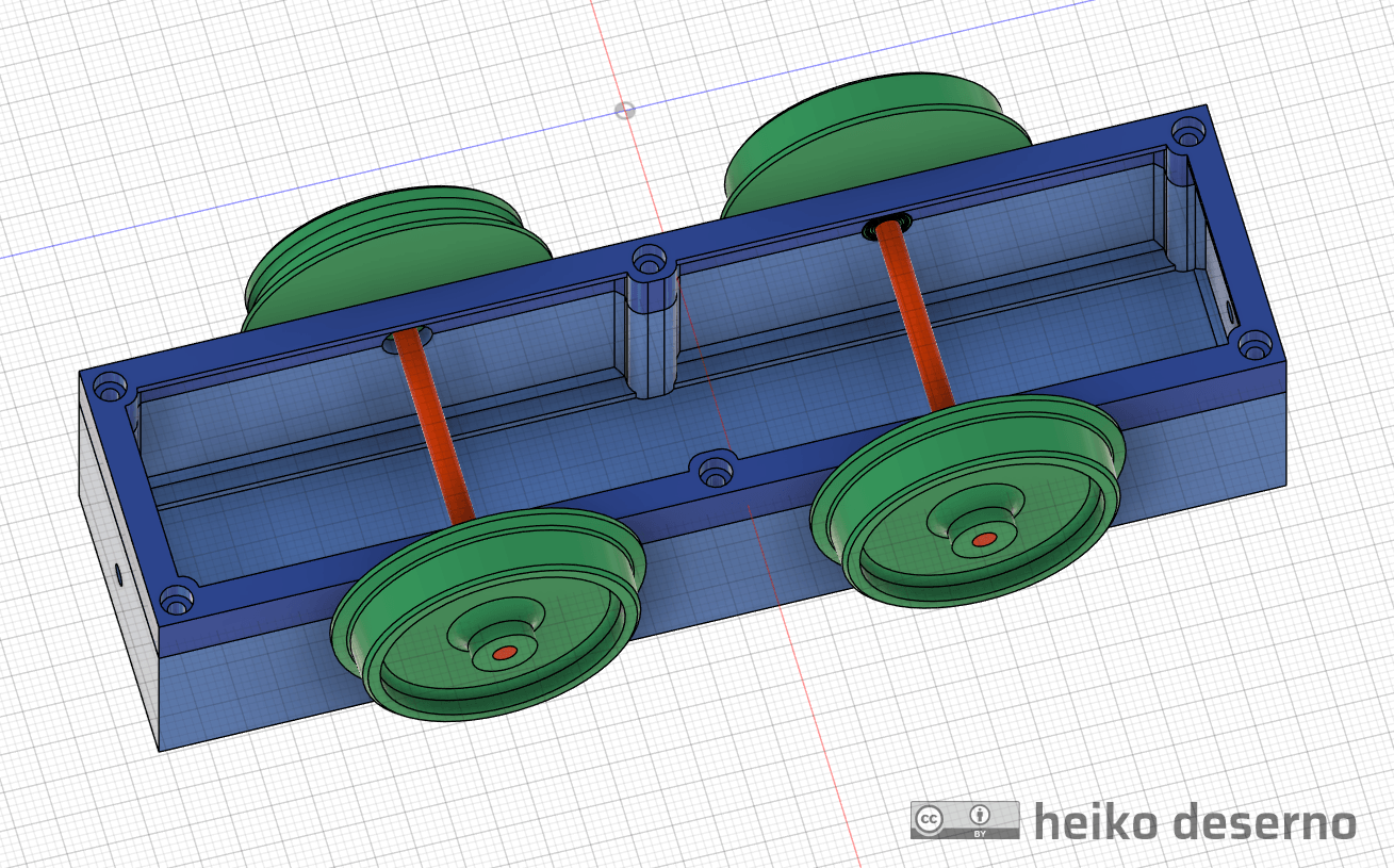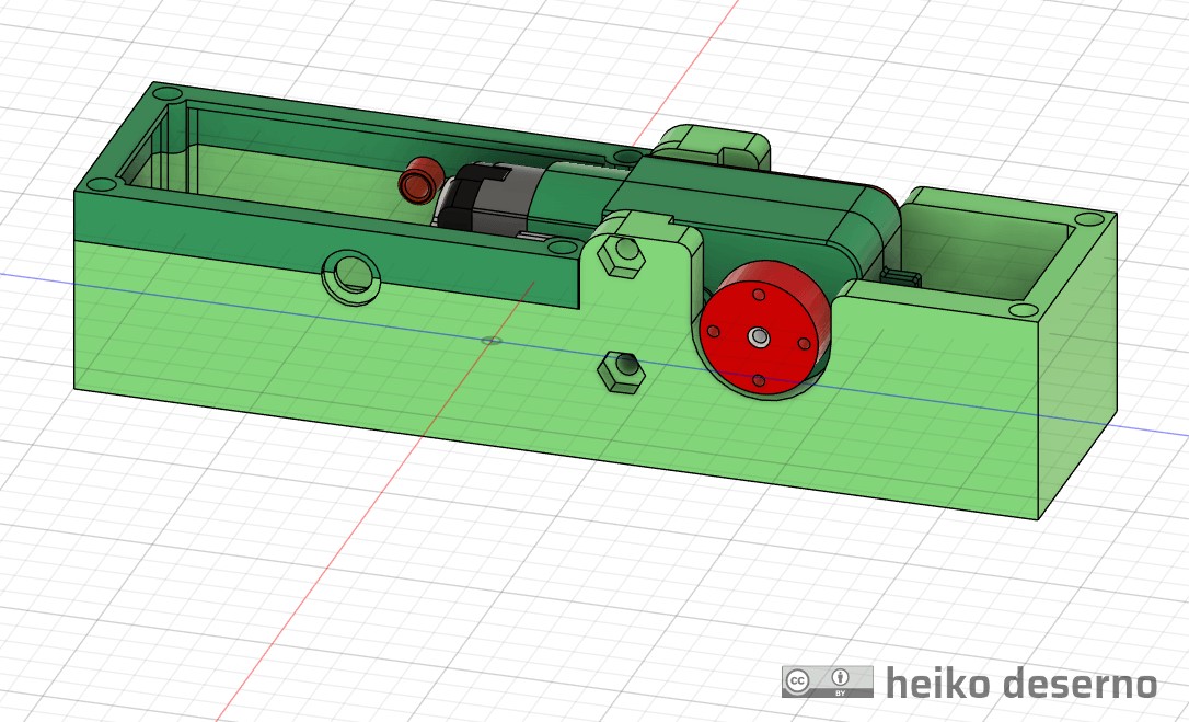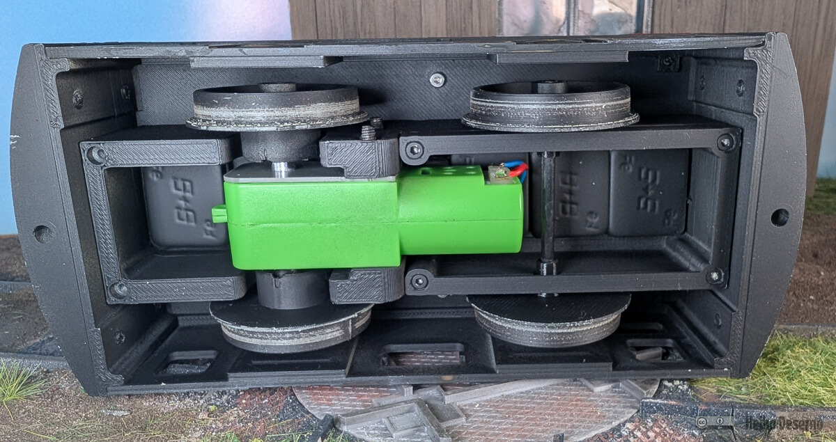 Für die motorisierte Variante des Fahrzeugs gibt es andere Druckteile, wobei die Befestigungen zum Lokrahmen genau wie die anderen Antriebsblöcke passen. Im Getriebemotor sind bereits Bohrungen für M3-Schrauben vorhanden. Die Motorgehäuse sind quasi standardisiert und technische Zeichnungen sind vorhanden. Aber in Details können die Motor-Modelle verschieden sein.