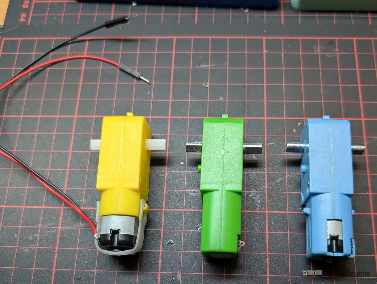 Die Bildserie zeigt den gelben Motor in Kunststoffausführung. Die anderen beiden Motoren besitzen im Inneren Metallteile. Auch wenn sie gleich aussehen, gibt es Unterschiede. Der grüne Motor, den ich verbaut habe, hat an den Wellenenden ein M3 Gewinde. Der blaue Motor dagegen hat ein M2,5-Gewinde. In die Kunststoffwelle des gelben Motors kann eine M2,5-Schraube eingeschnitten werden.