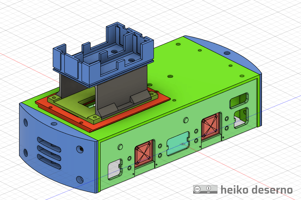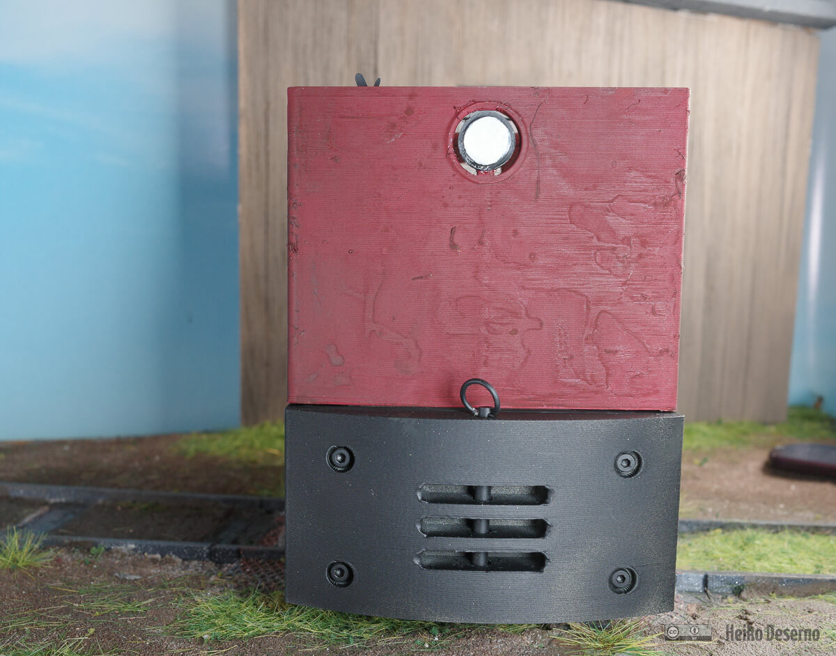 Die Mittelwand zur Motorhaube besteht aus 5 Einzelteilen. Zwei Modellvarianten können umgesetzt werden. Für die motorisierte Variante gibt es eine Aussparung für einen einpoligen Miniaturschalter. An der Unterseite werden zwei Gewindeeinsätze M2 für die Verbindung zum Lokrahmen eingeschmolzen. Auf der Rückseite ist eine Öffnung zur Durchführung der Kabel vorgesehen. Außerdem gibt es hier einen schraubbaren Befestigungswinkel für die Fixierung der Motorhaube.