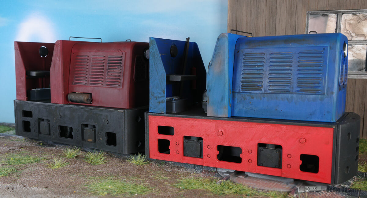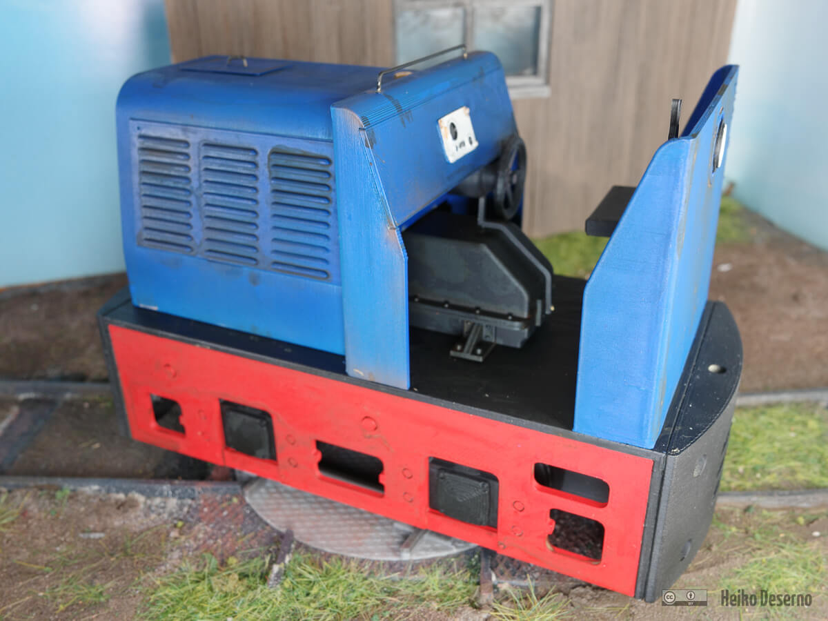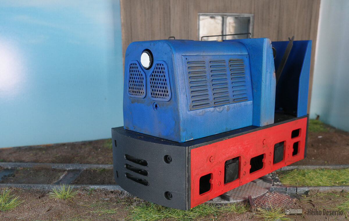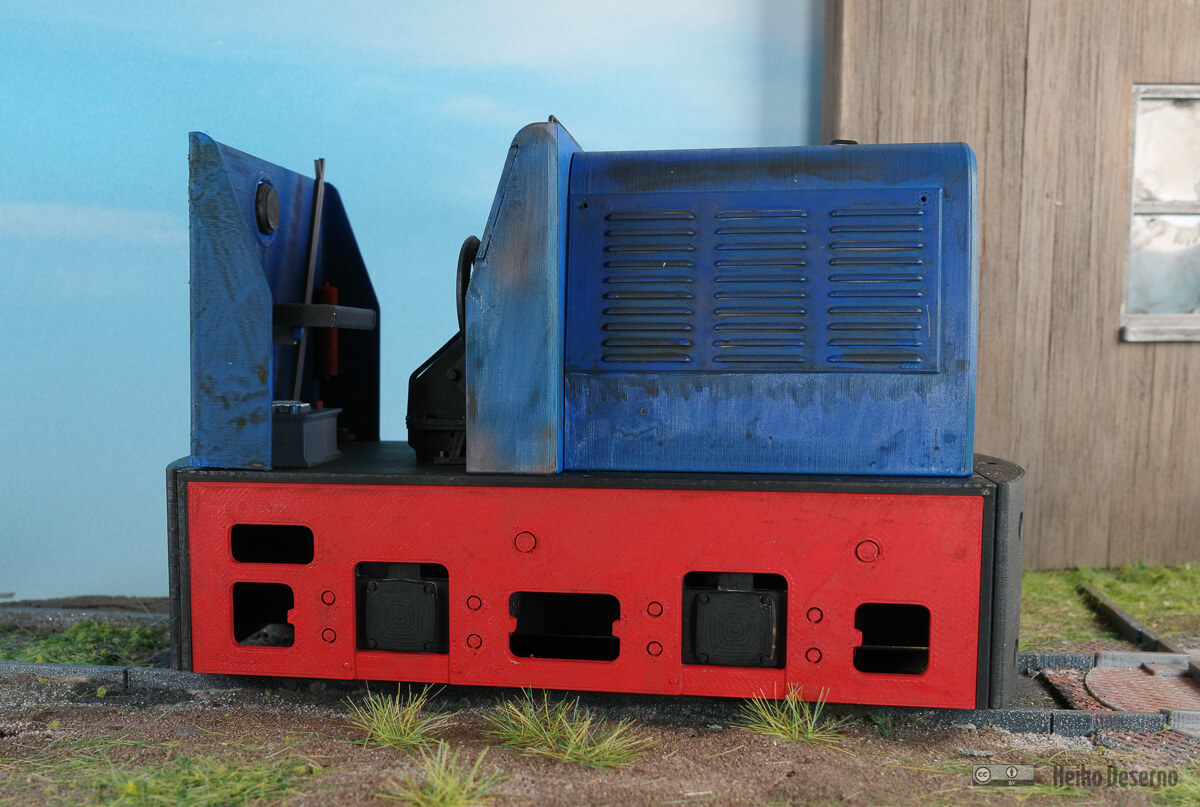 Die Farbgebung meiner Modelle orientiert sich an realen Vorbildern. Die blaue Lok habe ich im sächsischen Eisenbahnmuseum in Chemnitz-Hilbersdorf gesehen. Zum schwarzen Rahmen gesellen sich rote Seitenteile und ein blauer Aufbau (Motorhaube, Rückwand, etc.). Für die Lackierung habe ich Airbrush-Farben von Vallejo verwendet:
