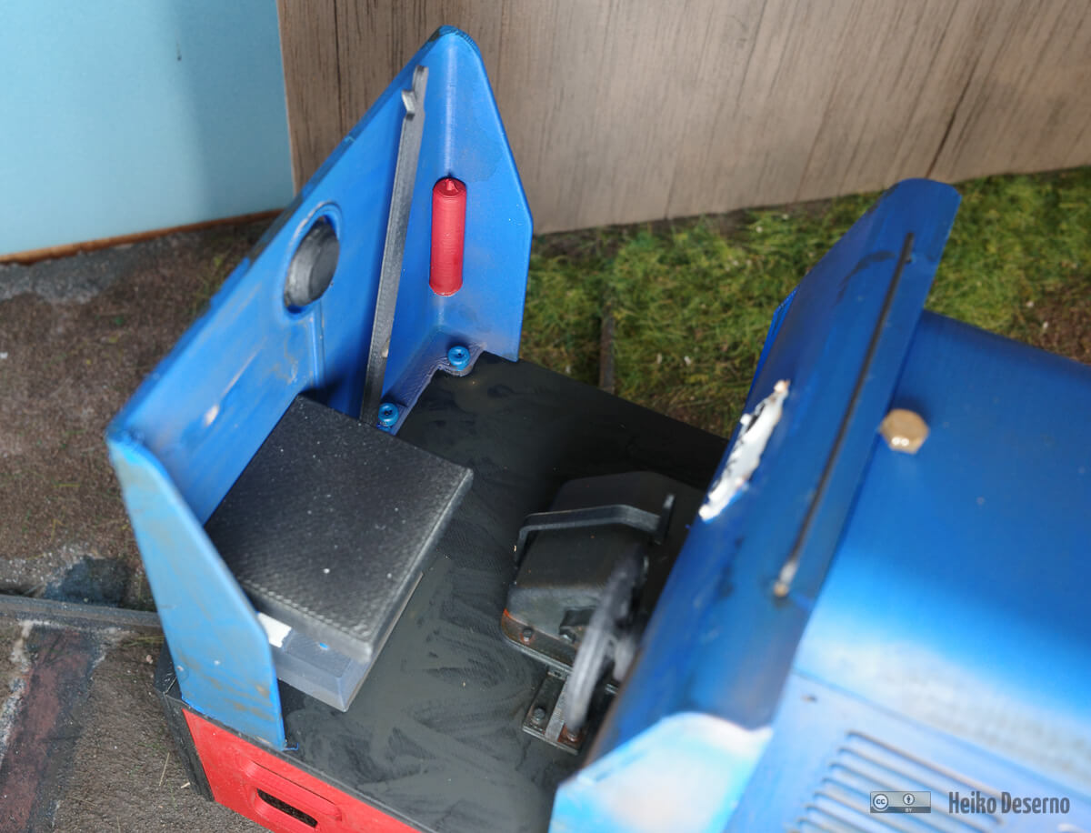 Die 8 Teile der Rückwand werden zum großen Teil verklebt. Der Sitz ist steckbar ausgeführt. Der Bremshebel wird durch eine M 1,6-Schraube in der Halterung fixiert und ist beweglich gelagert. Die Lampe und der Feuerlöscher wurden in meinen Modellen nach der Lackierung befestigt. Die gesamte Rückwand wird mit 4 Stück M2-Schrauben am Lokrahmen befestigt, die mittleren Schrauben reichen dabei bis in die Gewindeeinsätze des Antriebsblocks.