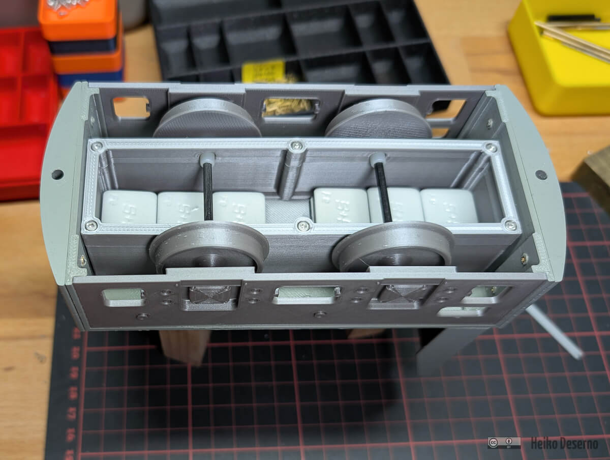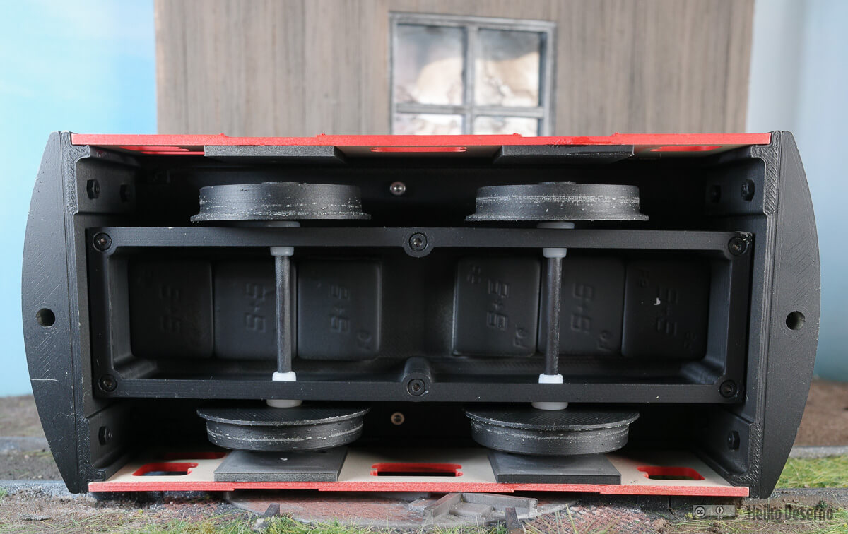 Für eine gute Optik beim Druck mit Filament besteht das Getriebe aus 7 Einzelteilen. Alles wird verklebt und das Getriebe als gesamtes Bauteil in den Lokrahmen gesteckt. Im Inneren des Getriebes ist etwas Platz für 3 kleine Ballastgewichte mit insgesamt 15 g.