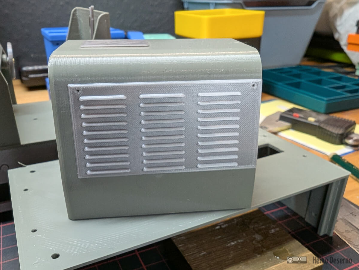 Je nach Modellausführung und Farbgebung werden einige Teile erst nach der Lackierung an der Motorhaube befestigt. Die Motorhaube ist so aufgebaut, dass sie in die Trägerplatte des Lokrahmens geschoben wird. Somit ist sie fixiert und kann nicht mehr verrutschen. Zusätzlich gibt es auf der Oberseite die 2 mm-Bohrung, in die eine Schraube oder ein Stift durch den Haltewinkel der Mittelwand gesteckt wird.