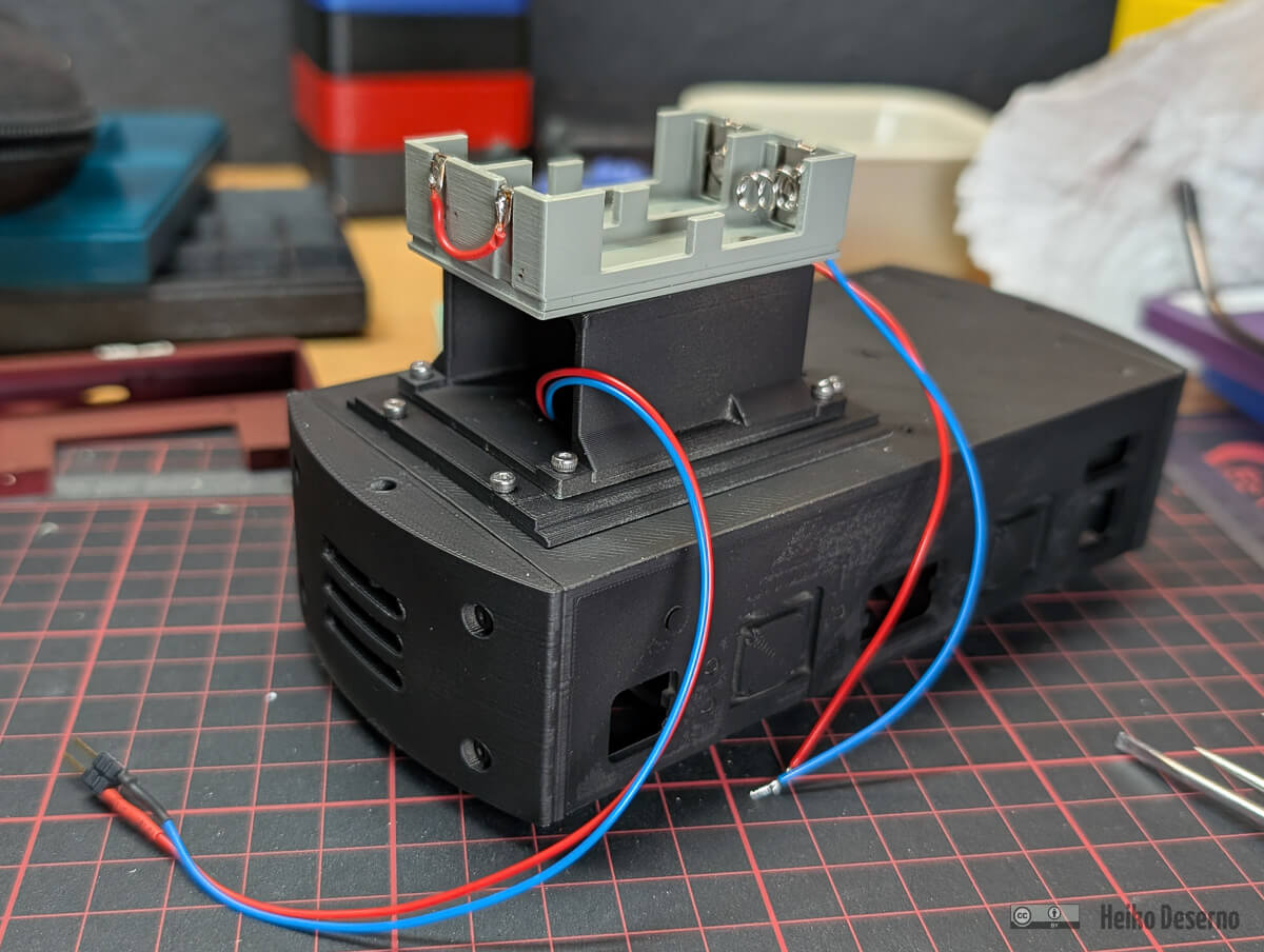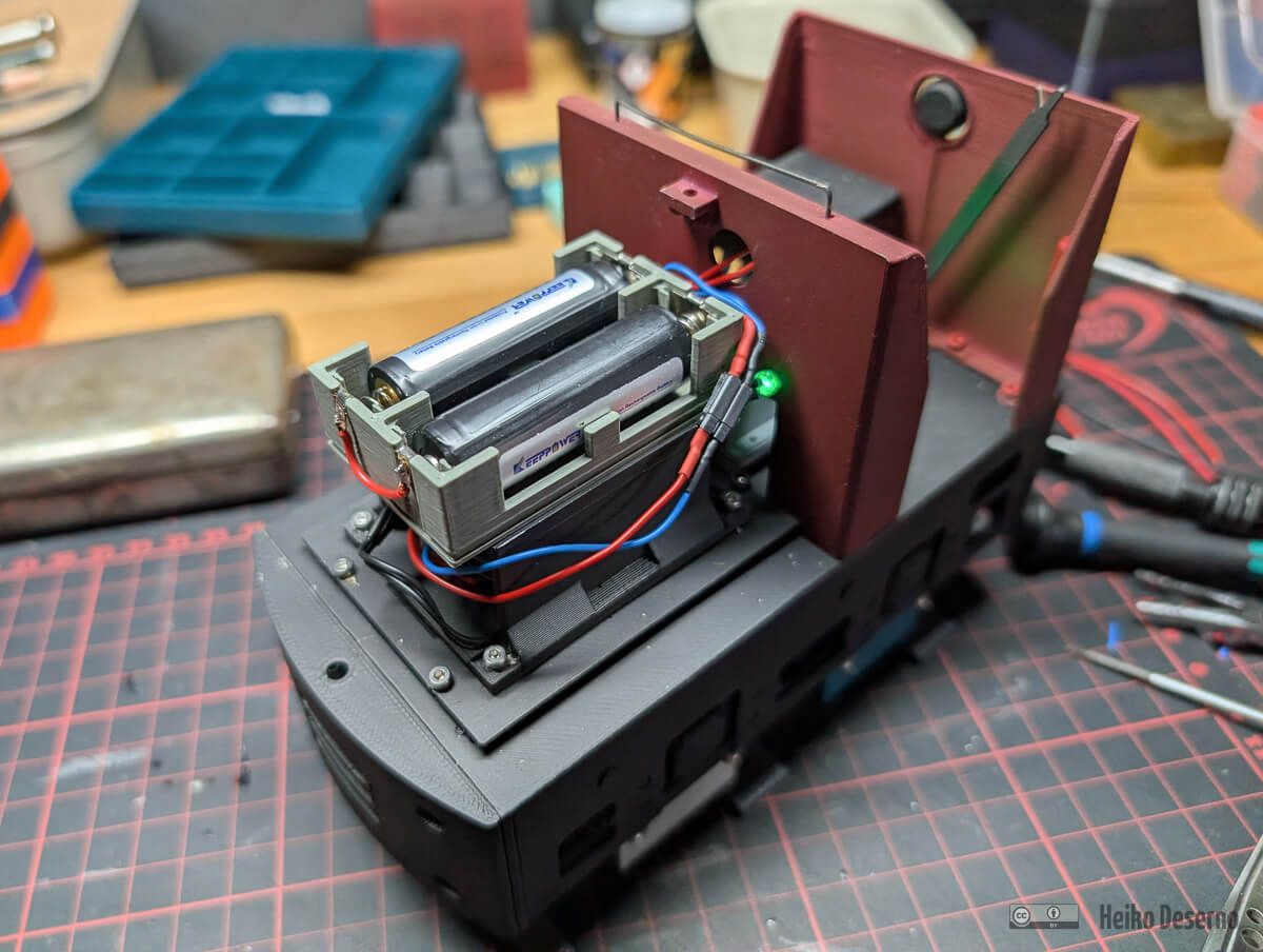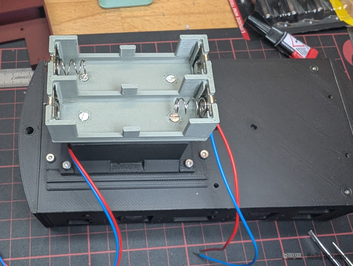 Für das motorisierte Modell werden neben dem Antriebsblock mit Motor weitere Komponenten benötigt. Der Motor gibt die Versorgungsspannung vor. Eine LiIo-Zelle ist für den Betrieb zu wenig. 2 Zellen mit je 3,7 Volt sind für den Getriebemotor genau richtig. Unter der Motorhaube ist genug Platz für die Akkus und die Steuerung. Ich habe für mein Fahrzeug einen Batteriehalter für zwei 14430-Akkuzellen vorgesehen. Passende Akkus sind beispielsweise Keeppower 14430 mit Schutzelektronik. Die Bezeichnung deutet eigentlich auf eine Zelle mit 14 mm Durchmesser und 430 mm Länge. Durch die Schutzelektronik sind diese Zellen jedoch mit 460 mm etwas länger. Das Batteriefach im Download berücksichtigt diese Eigenschaft. Meine Akkus stammen aus 2024 und haben eine Kapazität von 1050 mAh. Mittlerweile gibt es die gleiche Baugröße bereits mit 1300 mAh. Passende Federkontakte für das Batteriefach hatte ich in früheren Artikeln vorgestellt und sie sind auch in den Materiallisten des Downloads enthalten.