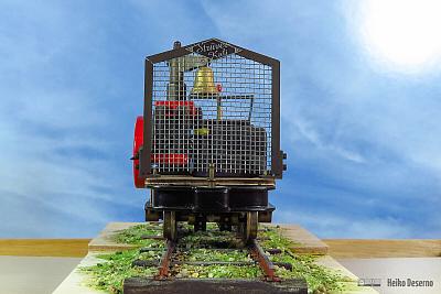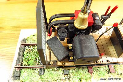 Aufgefallen sind mir die unzähligen kleinen Schrauben und Muttern, mit denen die Einzelteile zusammengesetzt sind. Ist das etwa alles Handarbeit? Der Rahmen hat die Größe des Standard-Lorenrahmens, besteht jedoch vollständig aus Metall. Auf dem Rahmen sitzt eine Sperrholzplatte, die weitere Aufbauten trägt.