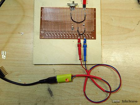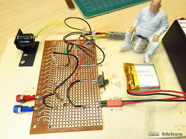 Zur Probe habe ich den Empfänger auf einer Testplatine fliegend mit den Leds, dem Akku sowie Schalter und Ladebuchsen fliegend verkabelt. Gut ist, dass die einige Anschlussleitungen bereits am Empfänger angebracht waren. Nicht so gut dagegen ist, dass ich an die Ausgänge P1 bis P3 selbst Kabel anlöten muss. Die Empfängerplatine ist schon sehr klein.
