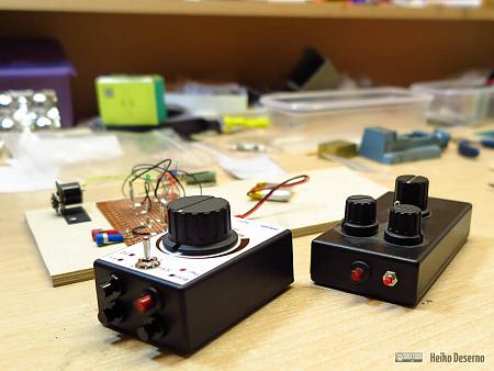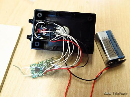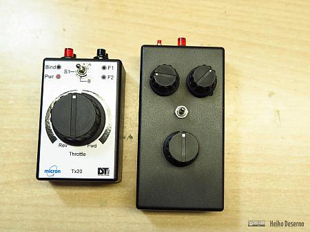 Obwohl ich nicht alle Bedienelemente an den Sendern benötige, habe ich diese vollständig aufgebaut. Der Minimalausbau, der für die meisten Anwendungen genügt, wäre neben dem Geschwindigkeitsregler und dem Ein-/Aus-Schalter der Bind-Taster. Dann könnte sicher auch ein kleineres Gehäuse verwendet werden.