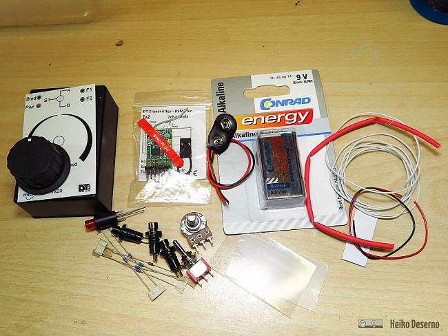 Die Bausätze der Empfänger Tx20 habe ich dieses Mal nicht bei Deltang, sondern bei Micron Radio Control bestellt. Das Kit enthält alle Bauteile für den Sender. Lediglich ein 9V Batterieblock muss separat erworben werden. Neu ist auch die bedruckte Folie für das Gehäuse, die bei meinem früheren Tx22 noch nicht dabei war.