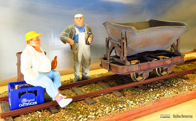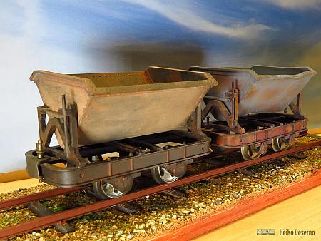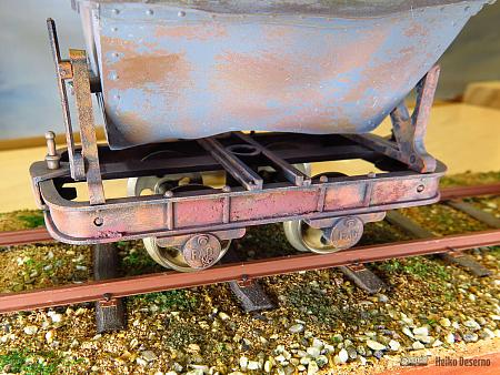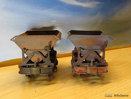 Die Zusatzteile sind bei der Firma Regner im Zubehörsortiment erhältlich. Die Lore gehört zu den Großen ihrer Gattung. Es gibt bei den richtigen Feldbahnen sowohl kleine Muldenkipper (Fassungsvolumen <= 1 qm) als auch große Exemplare mit >= 1,5 qm Volumen. Diese haben meist stabilere Radlager (siehe Muldenkipper in Neuenmarkt). Nun kann man darüber streiten, ob die Regnerloren nicht dem Maßstab 1:22,5, sondern eher 1:20 entsprechen, oder ob es sich tatsächlich um schwere Muldenkipper handelt.
