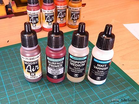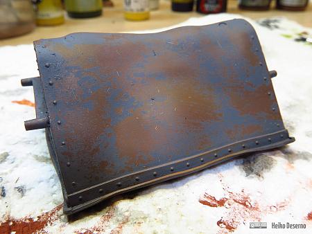 Die erste Farbgebung erfolgt mit der Grundierung Rot-Braun von Vallejo. Damit wird schon der grundlegende Rostton festgelegt.