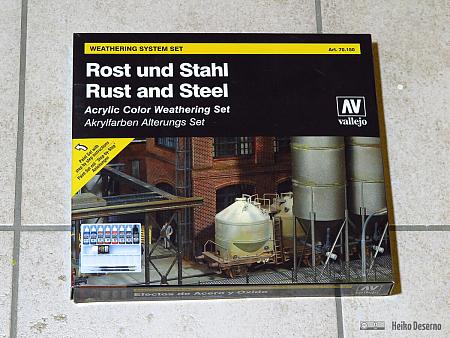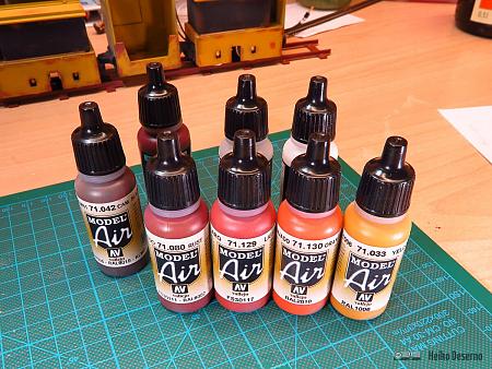 Für die Rostspuren benutze ich das Vallejo-Set 71186 „Rust and Chipping Effects“. In dem Set sind neben dem Primer 5 Rostfarben, das Chipping-Medium und matter Klarlack enthalten. Alle Farben sind aus der Model-Air Serie und für Airbrush vorgesehen. Typische Anwendungsgebiete für dieses Farbenset sind größere Flächen wie z.B. die Außenhaut eines Panzers oder eben die Kippmulde einer Feldbahn.