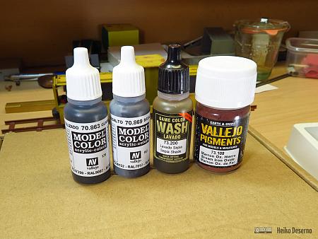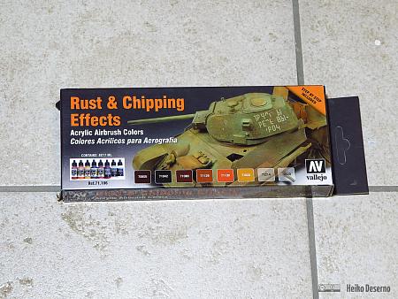 Ich habe zwei verschiedene Farbensets von Vallejo eingesetzt. Das erste Set Vallejo Rust & Chipping Effects ist für Airbrush vorgesehen. Das Aufsprühen der vielen Rostfarbtöne lohnt nur, wenn am Ende der Alterung große freiliegende Rostflächen entstehen. Nur dann sind die verschiedenen Farbtöne gut zu erkennen. Wenn nur wenig Farbe abplatzt, reicht die rostfarbene Grundierung von Vallejo als Untergrund bereits aus. Das Chipping-Mittel von Vallejo war in meinem Beispiel nicht so einfach anzuwenden, wie es in der Anleitung zu lesen war. Das Abblättern der oberen Farbschicht war sehr mühsam. Vermutlich habe ich das Chipping-Mittel vor dem letzten Farbauftrag zu lange trocknen lassen.