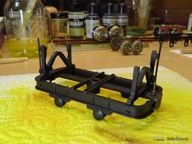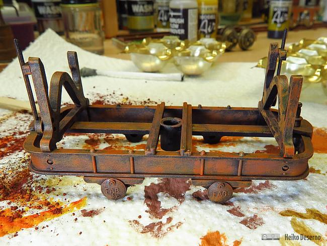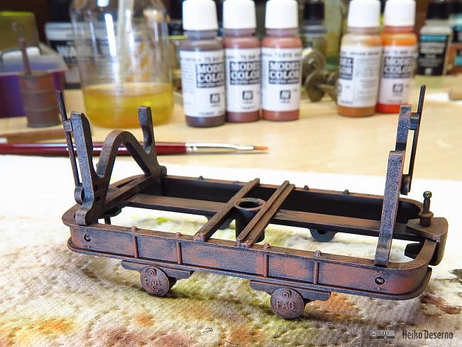 Bei der Bearbeitung der Kippmulde fiel mir auf, dass das Fahrgestell farblich nicht passen wird. Eine alte Kippmulde benötigt auch einen gealterten Lorenrahmen.