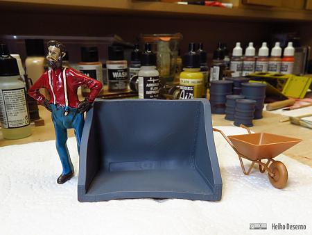 Nach dem Trocknen der Rostfarben habe ich das Chipping-Medium von Vallejo mit der Airbrush-Pistone großzügig aufgesprüht, nach dem Antrocknen dann die Kippmulde grau lackiert. 6 Schichten Farben (Grundierung, 3 * Rostfarben, Chipping-Medium und Grau) sind jetzt auf dem Modell.
