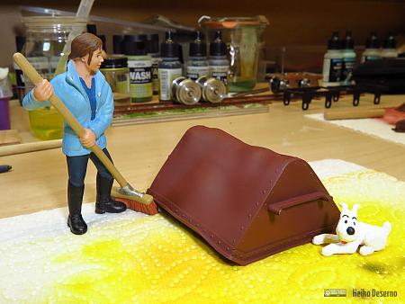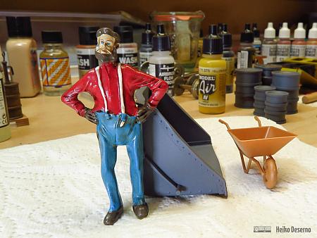 Dann ist mir aufgefallen, dass eine alte und stark verrostete Kippmulde nicht ohne Beschädigungen sein kann. Mit einer Heißluftpistole habe ich die Kunststoff-Kippmulde erwärmt und etwas verformt. Jetzt sieht sie wie nach einem Unfall aus. Der Effekt ist schon heftig und eigentlich gar nicht so stark gewollt. Als ich mit dem Erwärmen anfing, schmolz die Kippmulde fast dahin. Ich musst sie erst wieder in Form bringen. Für leichte Verformungen muss man wirklich vorsichtig mit der Heißluftpistole hantieren. Kippmulden aus Metall sind hier von Vorteil.
