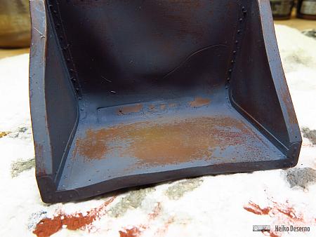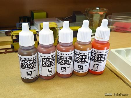 In dem Vallejo Farbenset sind neben der Grundierung 5 sprühfertige Rosttöne enthalten, die der Reihe nach von dunkel nach hell angewendet werden können. Ich habe die ersten drei dieser Rosttöne verwendet und jede Schicht ungleichmäßig aufgetragen. Rost bildet sich auch in der Realität in Schichten. Alter Rost ist dunkler und neuer hellerer Rost liegt darüber. Der Sinn des Vallejo-Sets ist der ungleichmäßige Farbauftrag der Rostfarben. Das Modell soll nicht einheitlich braun aussehen, sondern eher mit verschiedenen Farbtönen gefleckt sein wie in dem oben gezeigten Bild der O&K-Lok.