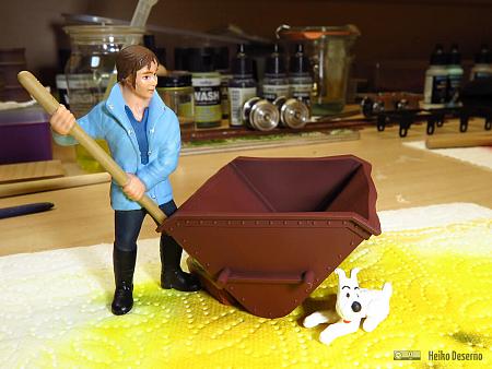 Im nächsten Schritt habe ich versucht, die obere Farbschicht mit einem feuchten Pinsel abzureiben. Das ging leider nicht so einfach. Das Chipping-Medium haftet besser als gedacht. Jedoch mit viel Einweichen (Wasser), Reiben und Wischen sowie Kratzen mit spitzen Gegenständen verschwanden Teile der Farbe und der Untergrund schaute durch. Ich wollte noch mehr Rost auf der Kippmulde, habe dann aber nach einiger Zeit aufgehört. Genaugenommen habe ich mehrere Tage mit dieser Kippmulde verbracht, natürlich nicht durchgängig.