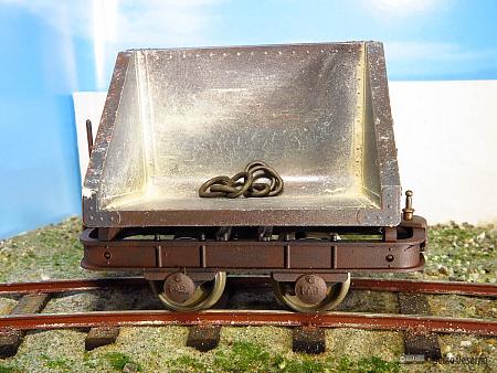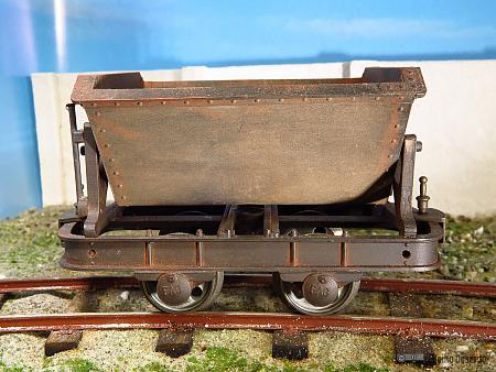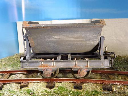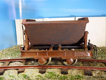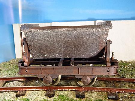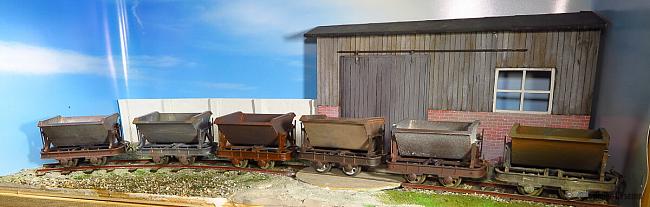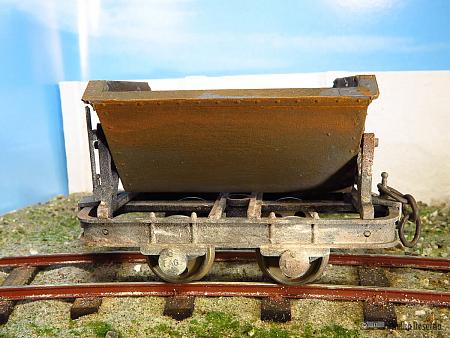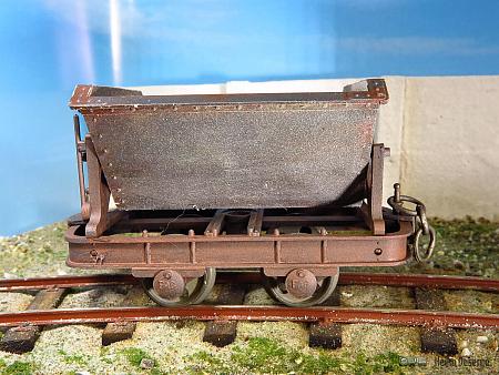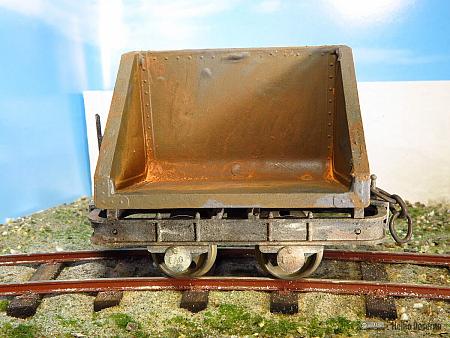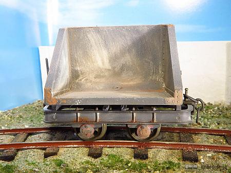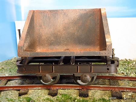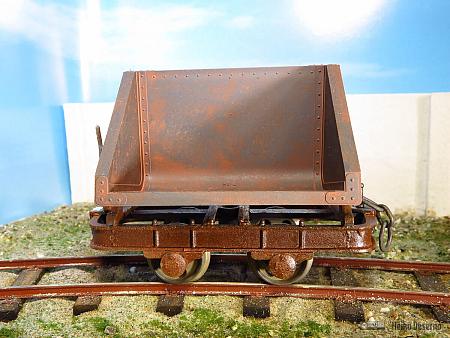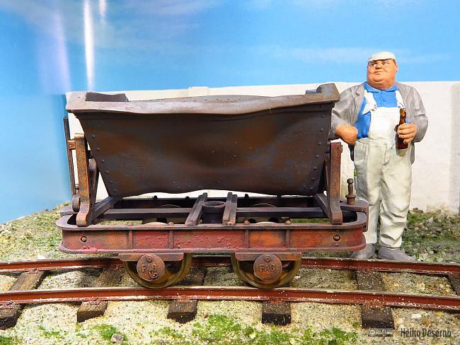 Es folgen jetzt Bilder von 6 Muldenkippern im gealterten Zustand. Immer zwei Bilder gehören zusammen. Die Alterung erfolgte ausschließlich mit Farben und ASOA-Pigmenten. Nicht ganz: An einer Lore habe ich das Produkt „Instant Rust“ ausprobiert. Das sind zwei Komponenten. Zuerst wird die Eisengrundierung satt wie eine Farbe aufgetragen. Nach dem Trocknen wird das Oxydationsmittel darüber gepinselt. Jetzt beginnt ein natürlicher Rostprozess, der mit der Zeit immer stärker wird. Später habe ich die Stellen mit Klarlack versiegelt, was den Effekt jedoch verdorben hat (siehe vierte Lore).