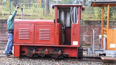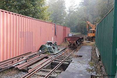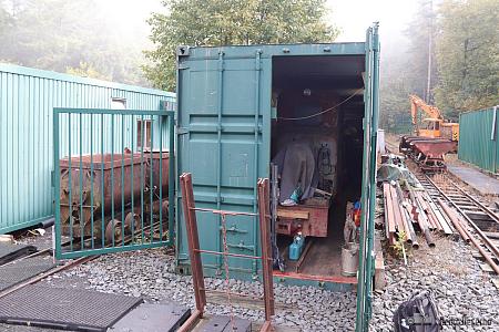 Auf dem Feldbahn-Gelände stehen mehrere Übersee-Container quasi als Lokschuppen. Diese Container scheinen für Feldbahn-Fahrzeuge geradezu gemacht zu sein. Sie passen bzgl. der Breite und Höhe sehr gut rein und ein wenig Platz zum Laufen ist auch noch vorhanden.