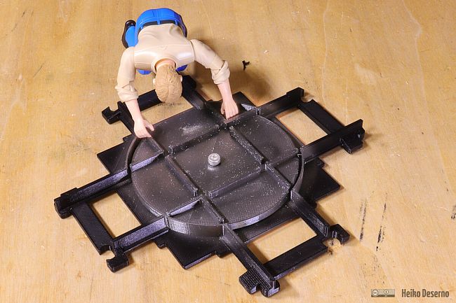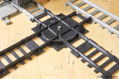 Die Drehscheibe ist zweiteilig ausgeführt. Die Grundplatte mit den Gleisenden sowie die Drehscheibe werden mit einer kurzen M3-Schraube verbunden. Wegen der Einfachheit habe ich keine elegante Lagerung mittels Kugellagern o.ä. vorgesehen.